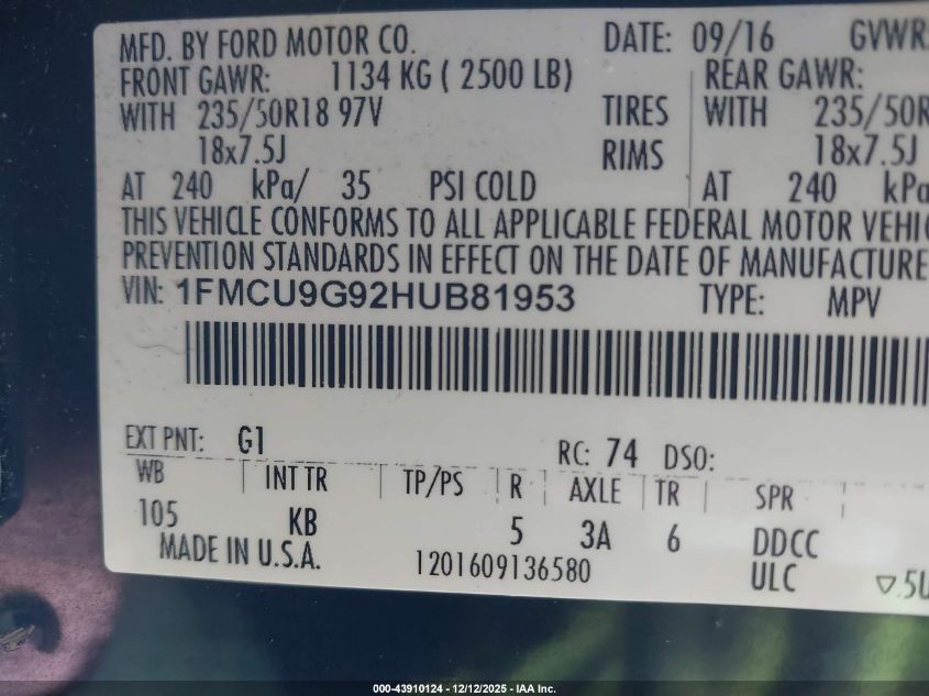 2017 FORD ESCAPE 2017 року Бензин, 2.0, Повний привід, vin - 1FMCU9G92HUB81953 з США