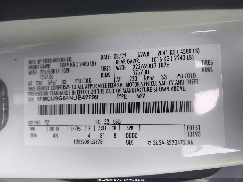 2022 FORD ESCAPE 2022 року Бензин, 1.5, Повний привід, vin - 1FMCU9G64NUB42699 з США