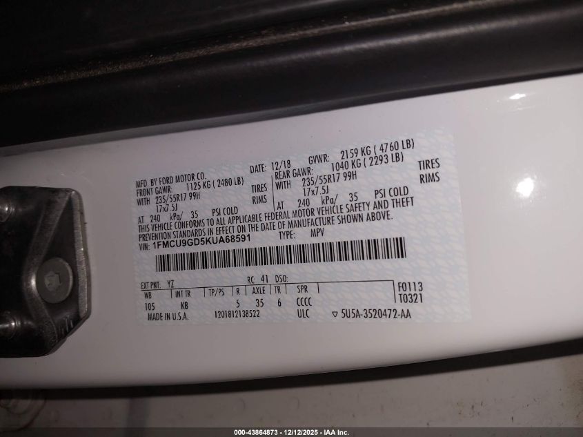 Колір БілийЦиліндри 4Привід Повний привідVIN 1FMCU9GD5KUA68591Стан Заводиться та їде (перевірено)Ушкодження Передня або задня AutoRIA