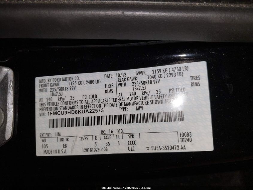 Колір ЧорнийЦиліндри 4Привід Повний привідVIN 1FMCU9HD6KUA22573Стан СтаціонарноУшкодження Вандалізм AutoRIA