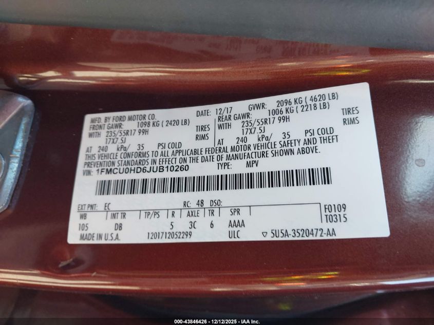 Колір ЧорнийЦиліндри 4Привід Передній привідVIN 1FMCU0HD6JUB10260Стан Заводиться та їде (перевірено)Ушкодження Задня AutoRIA