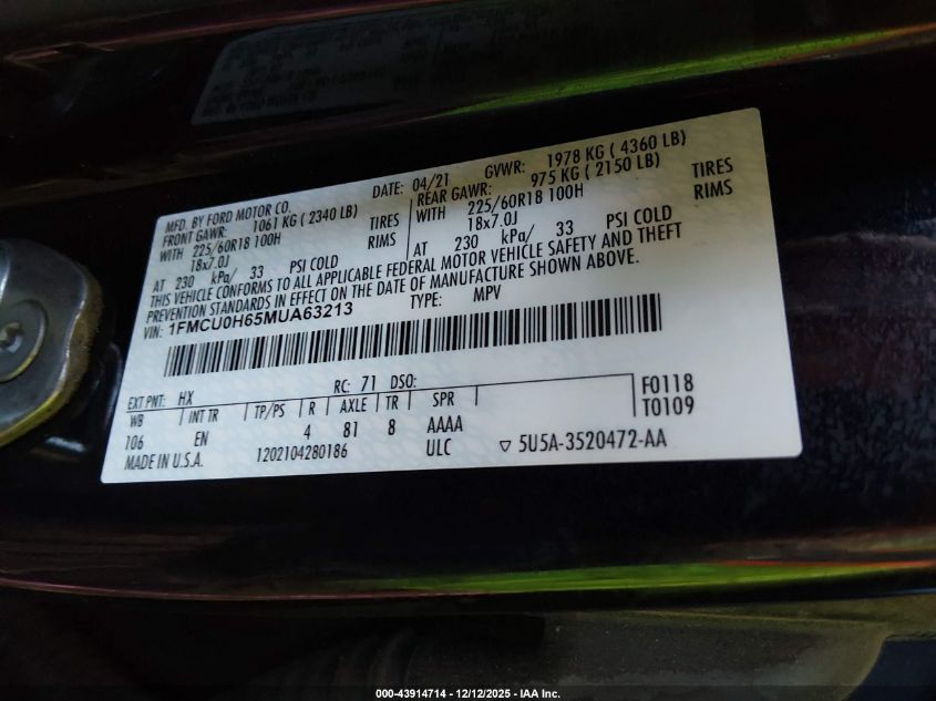2021 FORD ESCAPE 2021 року Бензин, 1.5, Передній привід, vin - 1FMCU0H65MUA63213 з США