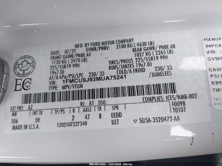 2021 FORD ESCAPE 2021 року Бензин, 2.0, Повний привід, vin - 1FMCU9J93MUA75241 з США