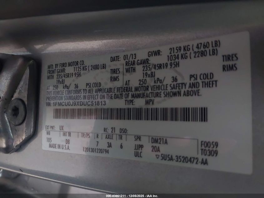 Колір СрібнийЦиліндри 4Привід Передній привідVIN 1FMCU0J9XDUC51813Стан Заводиться та їде (перевірено)Ушкодження Передня або задня AutoRIA