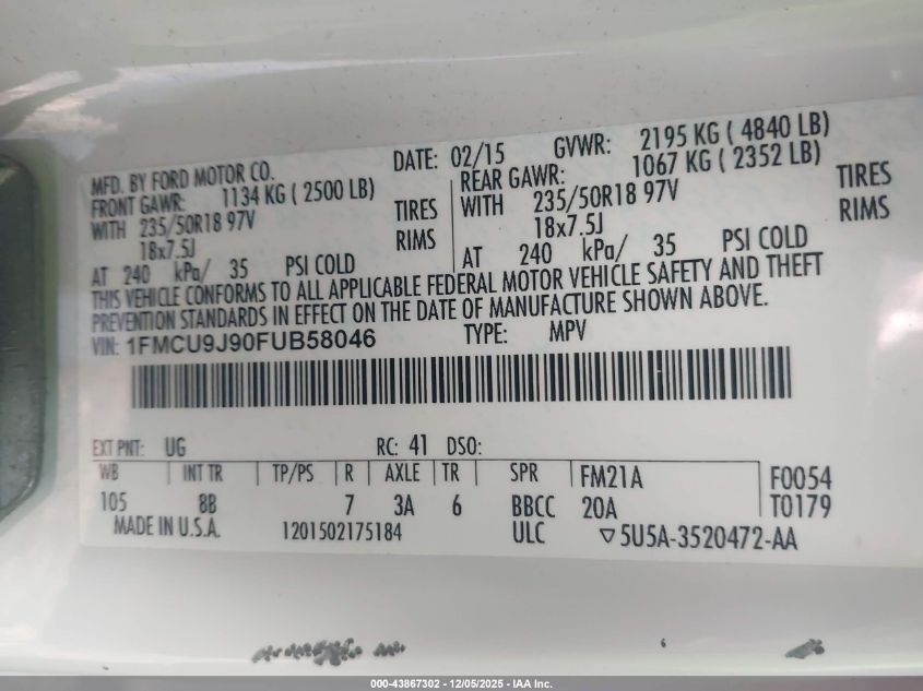 2015 FORD ESCAPE 2015 року Бензин, 2.0, Повний привід, vin - 1FMCU9J90FUB58046 з США