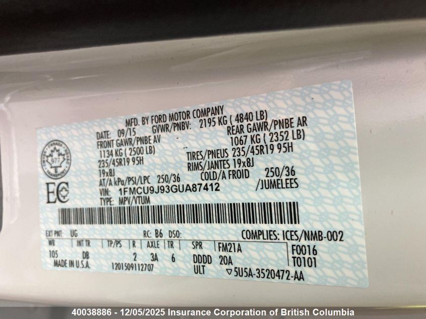 Колір БілийЦиліндри 4Привід Повний привідVIN 1FMCU9J93GUA87412Стан СтаціонарноУшкодження ЗадняДата аукціону 2025-12-08 AutoRIA