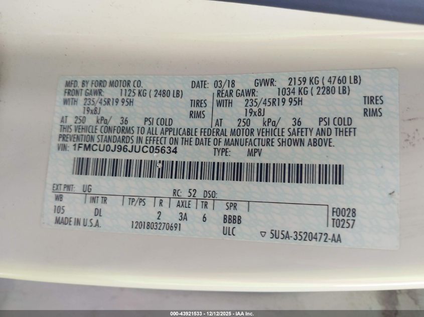 Колір БілийЦиліндри 4Привід Передній привідVIN 1FMCU0J96JUC05634Стан Заводиться та їде (перевірено)Ушкодження Права сторона AutoRIA
