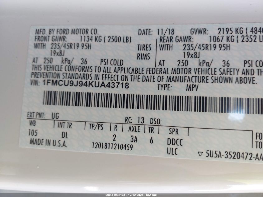 2019 FORD ESCAPE 2019 року Бензин, 2.0, Повний привід, vin - 1FMCU9J94KUA43718 з США