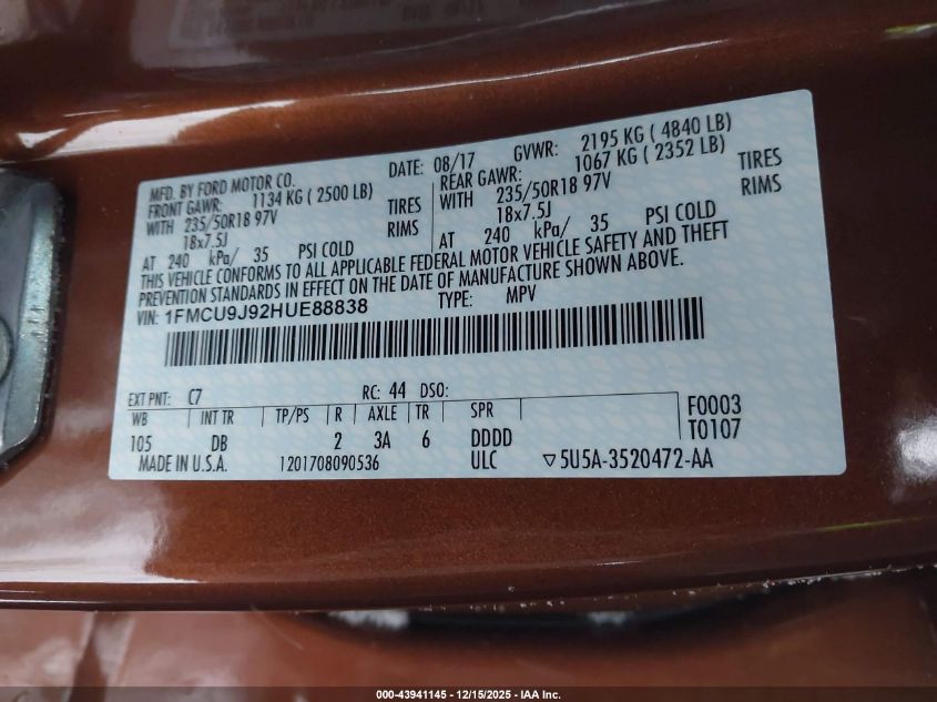 2017 FORD ESCAPE 2017 року Бензин, 2.0, Повний привід, vin - 1FMCU9J92HUE88838 з США
