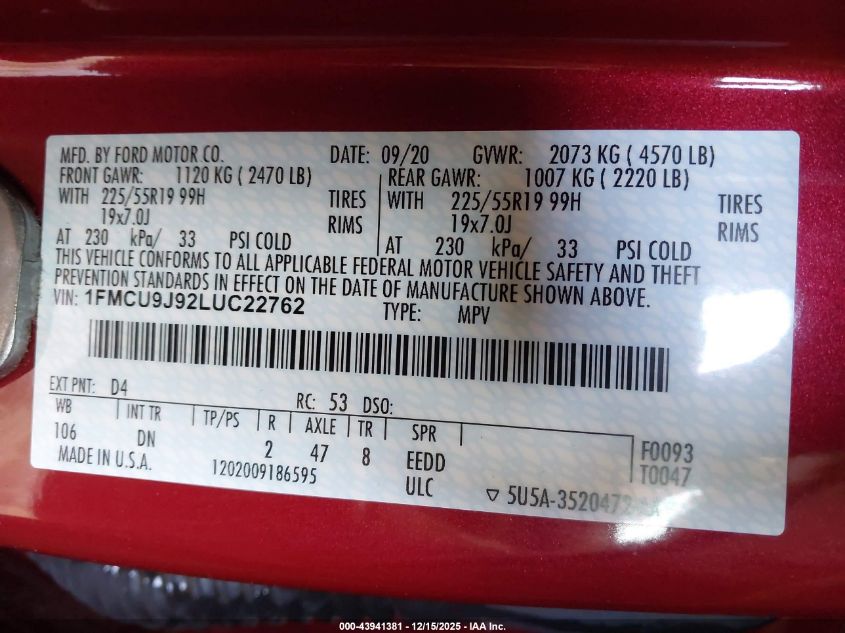 2020 FORD ESCAPE 2020 року Бензин, 2.0, Повний привід, vin - 1FMCU9J92LUC22762 з США
