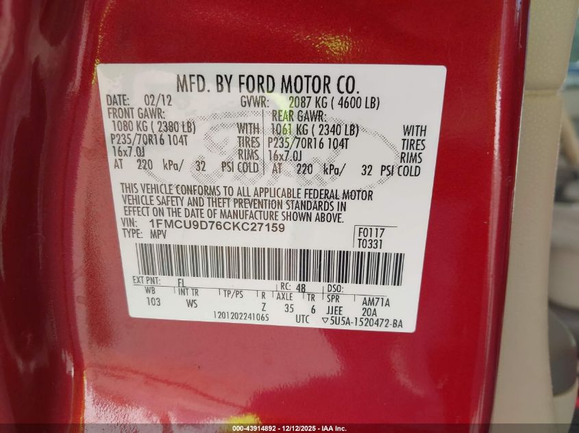 Колір ЧервонийЦиліндри 4Привід Повний привідVIN 1FMCU9D76CKC27159Стан СтаціонарноУшкодження Передня або задня AutoRIA