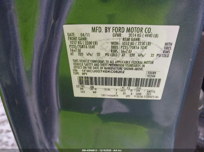 Колір СинійЦиліндри 4Привід Передній привідVIN 1FMCU0D74BKC08202Стан Заводиться та їде (перевірено)Ушкодження Передня або задня AutoRIA