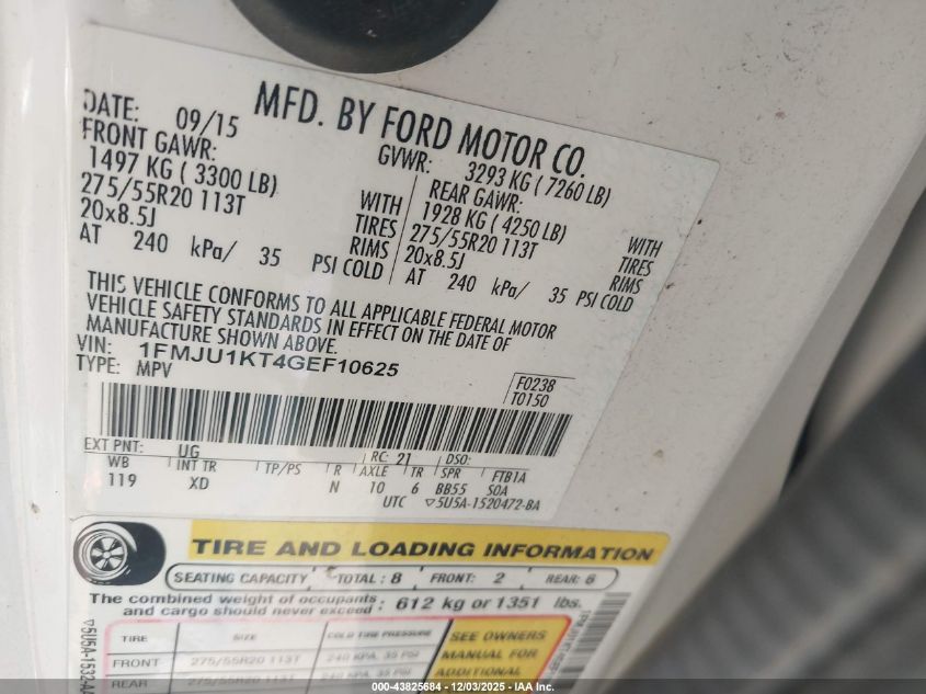 Колір БілийЦиліндри 6VIN 1FMJU1KT4GEF10625Стан СтаціонарноУшкодження Передня або задня AutoRIA