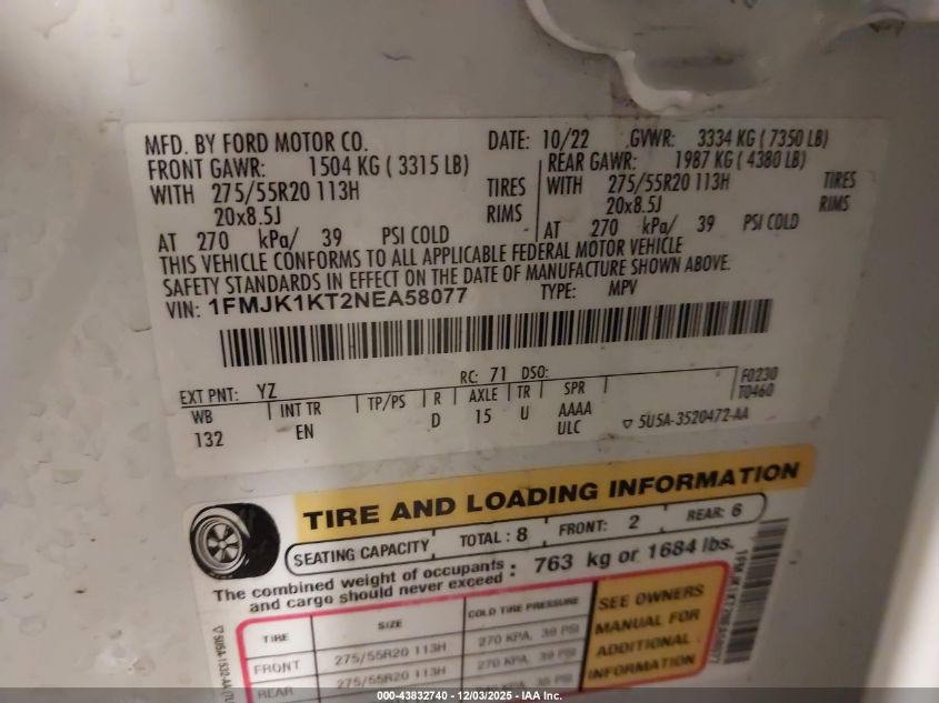 Колір БілийЦиліндри 6VIN 1FMJK1KT2NEA58077Стан Заводиться та їде (перевірено)Ушкодження Передня або задня AutoRIA
