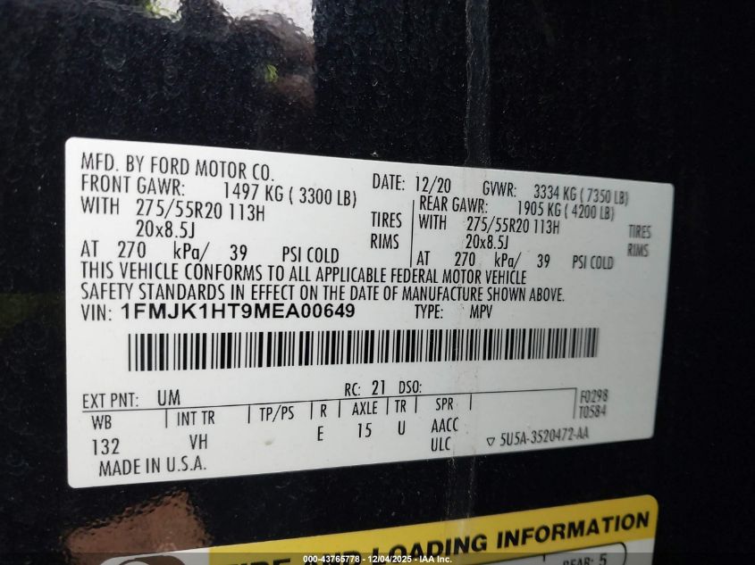 2021 FORD EXPEDITION 2021 року Бензин, 3.5, , vin - 1FMJK1HT9MEA00649 з США