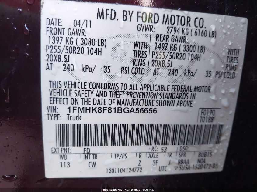 Колір БургундіяЦиліндри 6Привід Повний привідVIN 1FMHK8F81BGA56656Стан Заводиться та їде (перевірено)Ушкодження Передня або задня AutoRIA