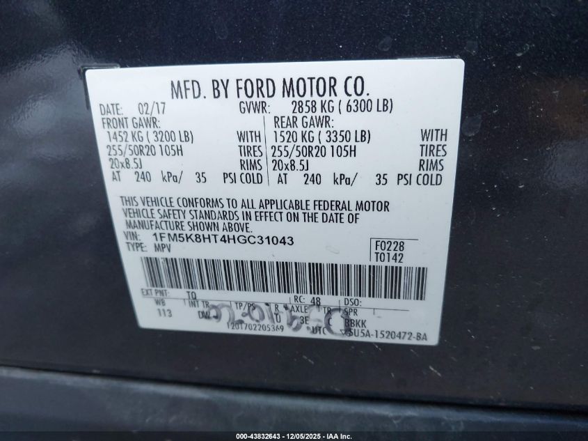 2017 FORD EXPLORER 2017 року Бензин, 3.5, Повний привід, vin - 1FM5K8HT4HGC31043 з США