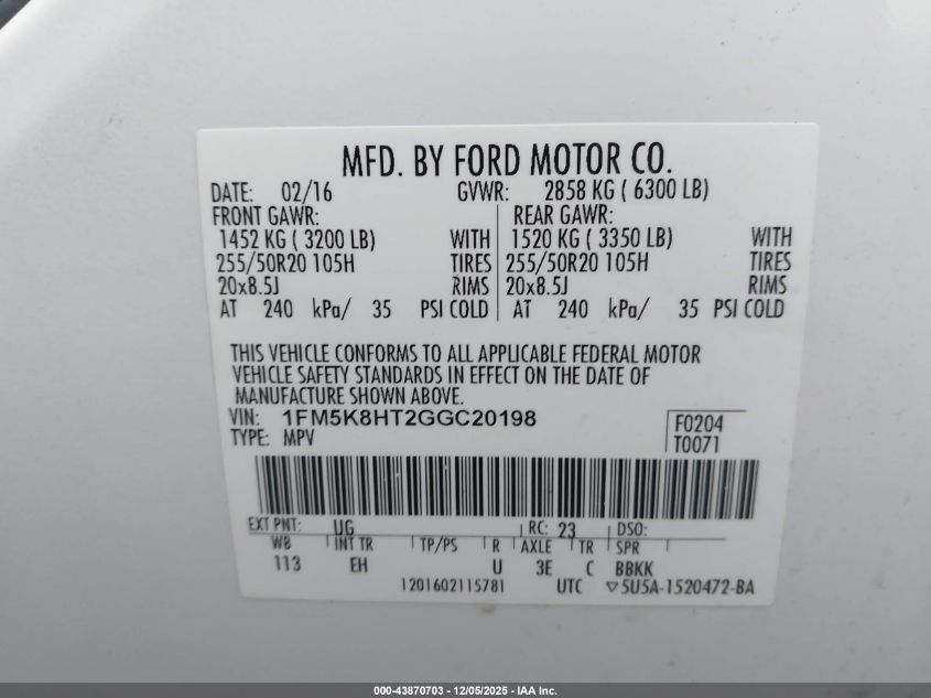 Колір БілийЦиліндри 6Привід Повний привідVIN 1FM5K8HT2GGC20198Стан Заводиться та їде (перевірено)Ушкодження Задня AutoRIA
