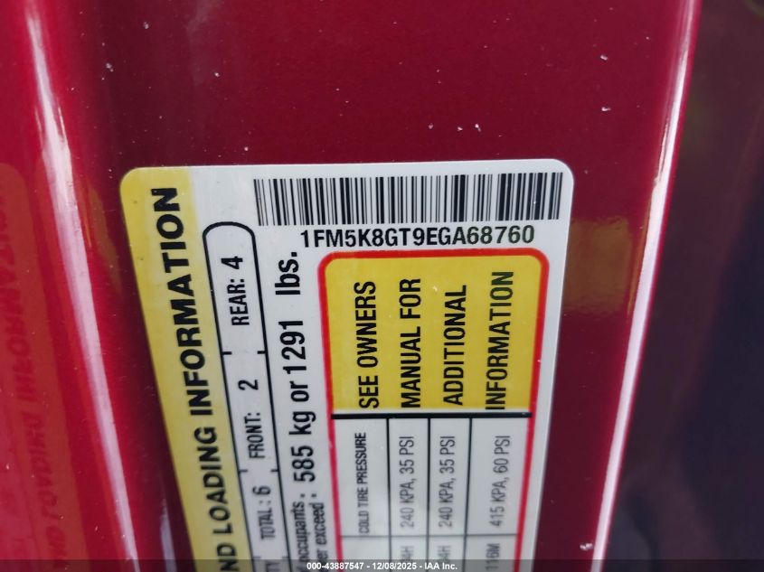 Колір ЧервонийЦиліндри 6Привід Повний привідVIN 1FM5K8GT9EGA68760Стан Заводиться та їде (перевірено)Ушкодження Звичайний зносДата аукціону 2025-12-16 AutoRIA