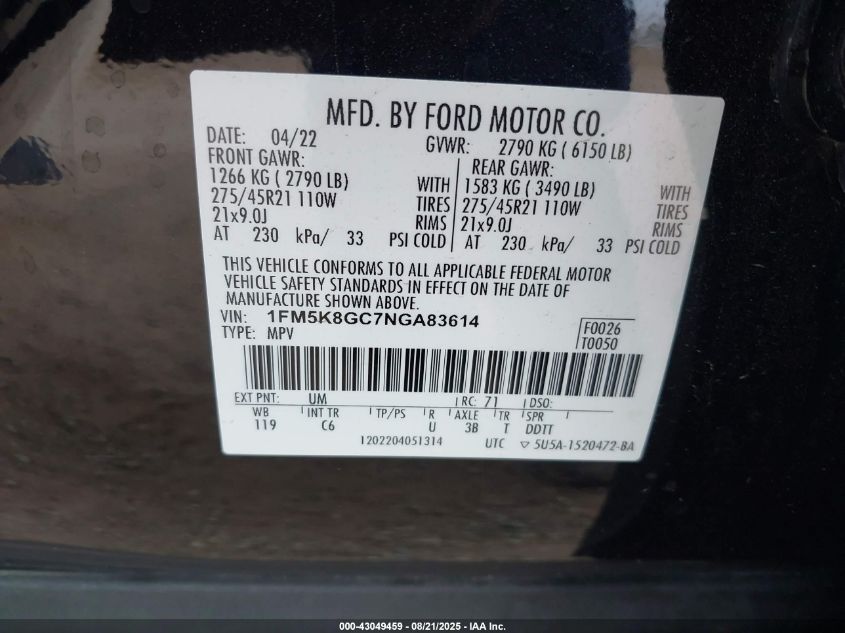 Колір ЧорнийЦиліндри 6Привід Повний привідVIN 1FM5K8GC7NGA83614Стан Заводиться та їде (перевірено)Ушкодження Передня або задняДата аукціону 2025-12-08 AutoRIA