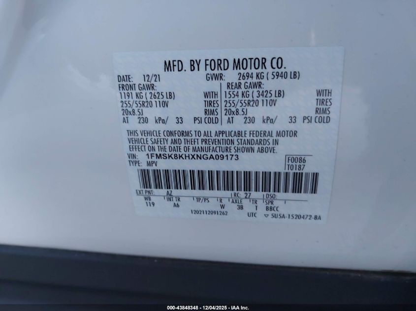 Колір БілийЦиліндри 4Привід Повний привідVIN 1FMSK8KHXNGA09173Стан Заводиться та їде (перевірено)Ушкодження Задня AutoRIA