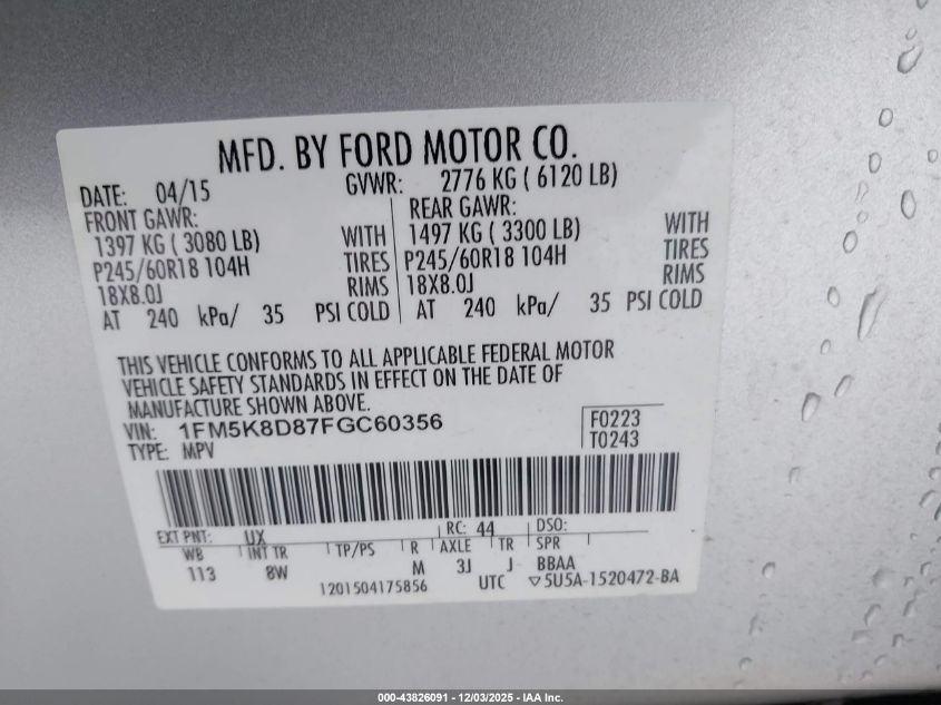 Колір СрібнийЦиліндри 6Привід Повний привідVIN 1FM5K8D87FGC60356Стан ЗаводитьсяУшкодження Передня і задня AutoRIA