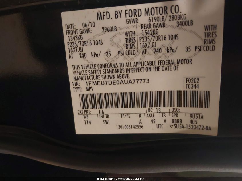 Колір ЧорнийЦиліндри 6Привід Повний привідVIN 1FMEU7DE0AUA77773Стан Заводиться та їде (перевірено)Ушкодження Передня ліва AutoRIA