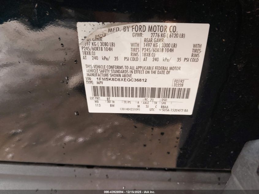 Колір ЧорнийЦиліндри 6Привід Повний привідVIN 1FM5K8D8XEGC36812Стан Заводиться та їде (перевірено)Ушкодження Ліва сторона AutoRIA