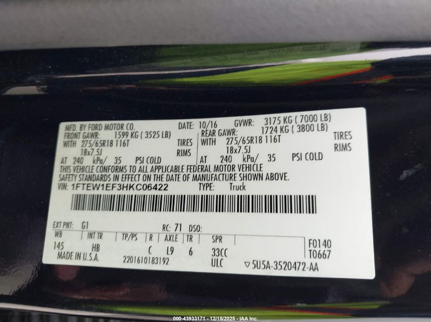 2017 FORD F-150 2017 року Бензин, 5.0, Повний привід, vin - 1FTEW1EF3HKC06422 з США