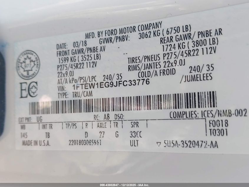 2018 FORD F-150 2018 року Бензин, 3.5, Повний привід, vin - 1FTEW1EG9JFC33776 з США