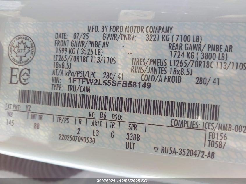 2025 FORD F-150 2025 року Бензин, , Повний привід, vin - 1FTFW2L55SFB58149 з США