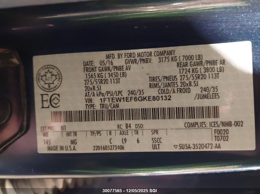 Колір СинійЦиліндри 8Привід Повний привідVIN 1FTEW1EF6GKE80132Стан Заводиться та їде (перевірено)Ушкодження ПередняДата аукціону 2025-12-10 AutoRIA