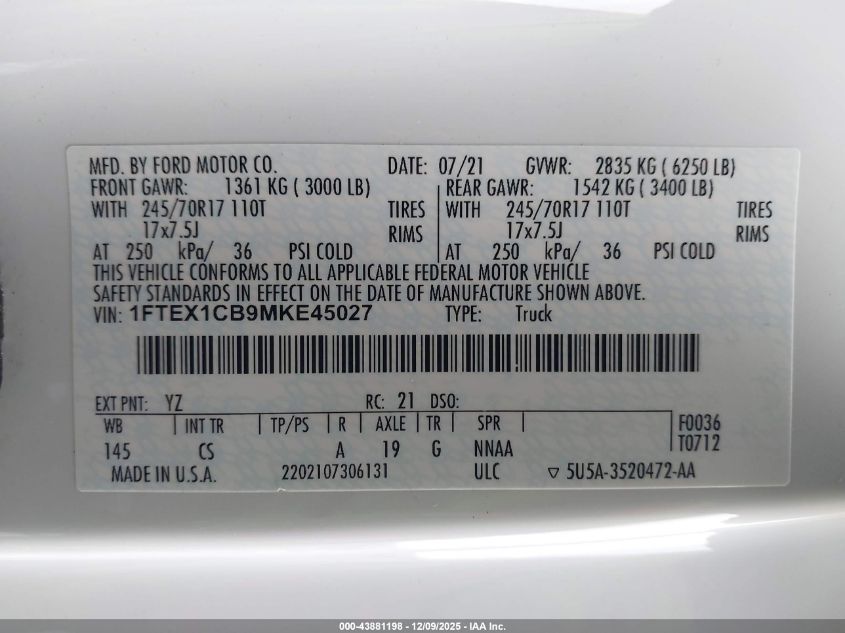 2021 FORD F-150 2021 року Бензин, 3.3, , vin - 1FTEX1CB9MKE45027 з США