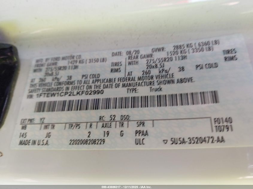2020 FORD F-150 2020 року Бензин, 2.7, , vin - 1FTEW1CP2LKF02990 з США