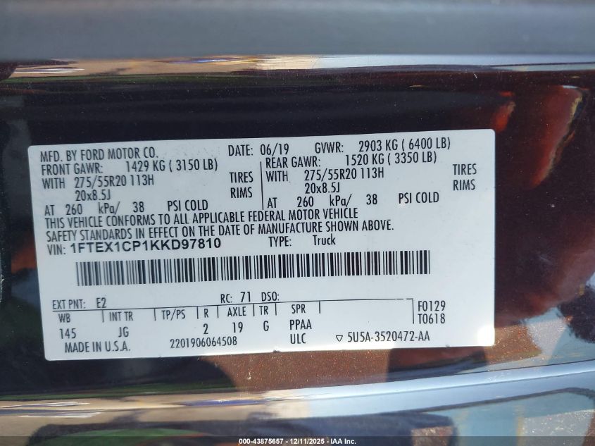2019 FORD F-150 2019 року Бензин, 2.7, , vin - 1FTEX1CP1KKD97810 з США