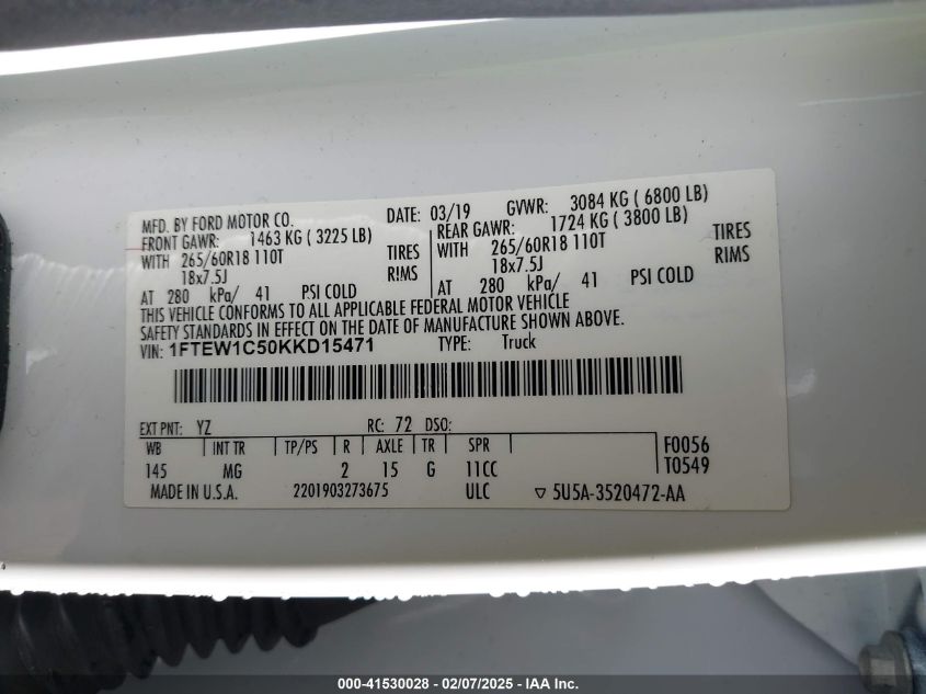 Колір БілийЦиліндри 8VIN 1FTEW1C50KKD15471Стан Заводиться та їде (перевірено)Ушкодження Задня AutoRIA