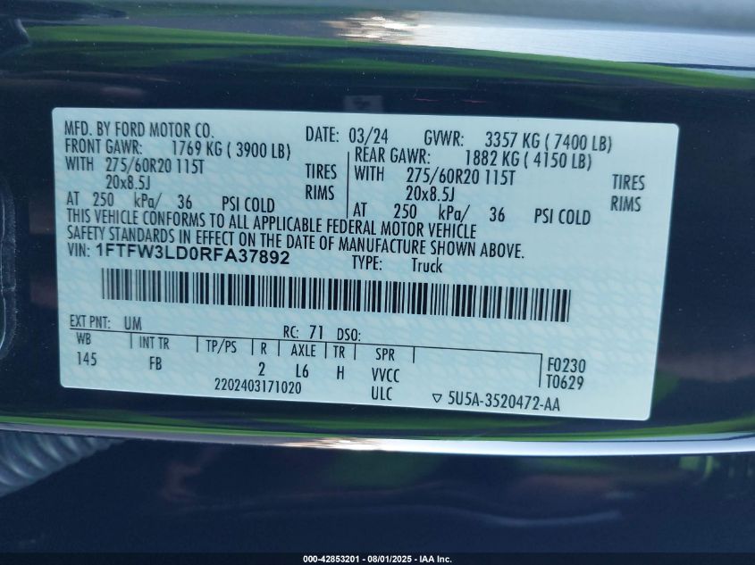 2024 FORD F-150 2024 року Гібрид, 3.5, Повний привід, vin - 1FTFW3LD0RFA37892 з США