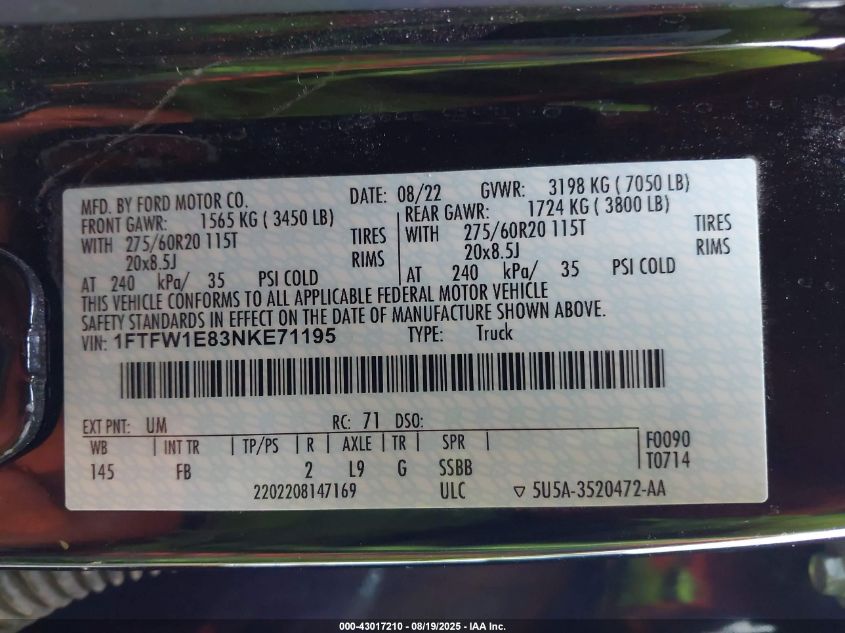 2022 FORD F-150 2022 року Бензин, 3.5, Повний привід, vin - 1FTFW1E83NKE71195 з США