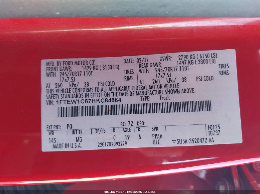 Колір ЧервонийЦиліндри 6VIN 1FTEW1C87HKC84884Стан СтаціонарноУшкодження Передня або задня AutoRIA