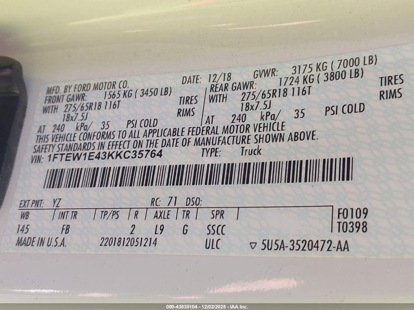 2019 FORD F-150 2019 року Бензин, 3.5, Повний привід, vin - 1FTEW1E43KKC35764 з США
