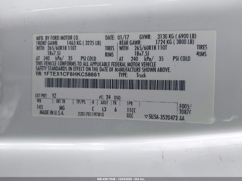 2017 FORD F-150 2017 року Бензин, 5.0, , vin - 1FTEX1CF6HKC58661 з США