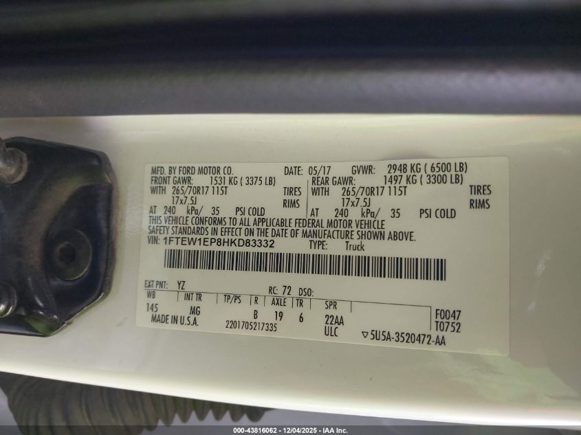 Колір БілийЦиліндри 6Привід Повний привідVIN 1FTEW1EP8HKD83332Стан Заводиться та їде (перевірено)Ушкодження Передня або задня AutoRIA