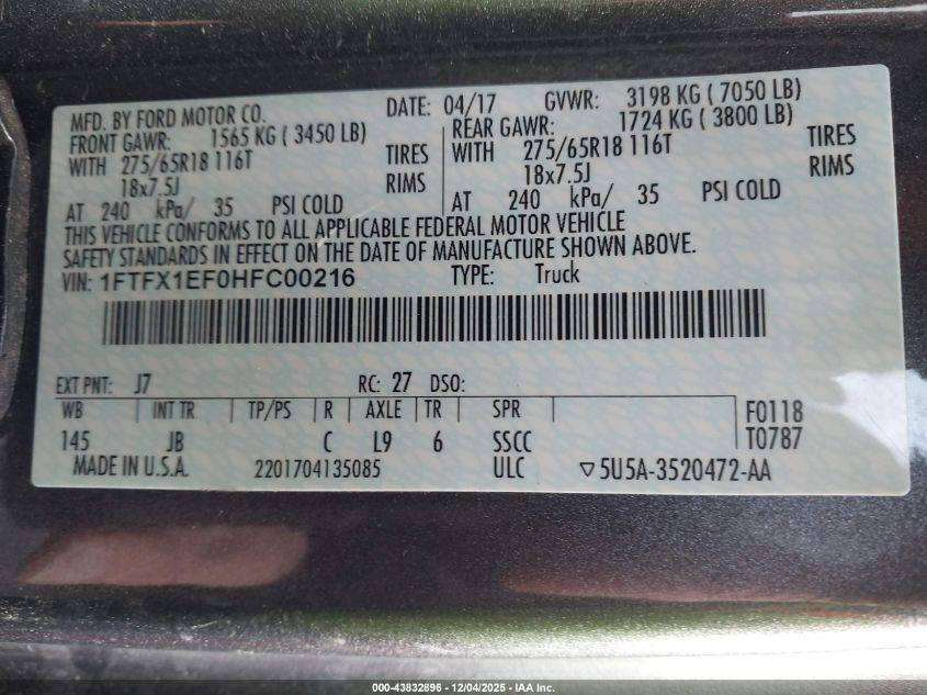 2017 FORD F-150 2017 року Бензин, 5.0, Повний привід, vin - 1FTFX1EF0HFC00216 з США