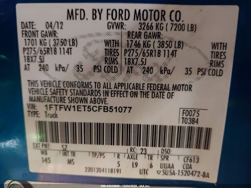 2012 FORD F-150 2012 року Бензин, 3.5, Повний привід, vin - 1FTFW1ET5CFB51077 з США