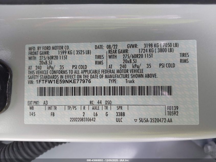 2022 FORD F-150 2022 року Бензин, 5.0, Повний привід, vin - 1FTFW1E59NKE77976 з США