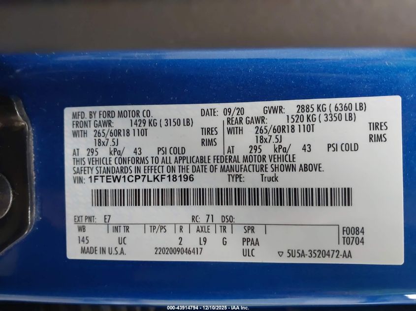 2020 FORD F-150 2020 року Бензин, 2.7, , vin - 1FTEW1CP7LKF18196 з США
