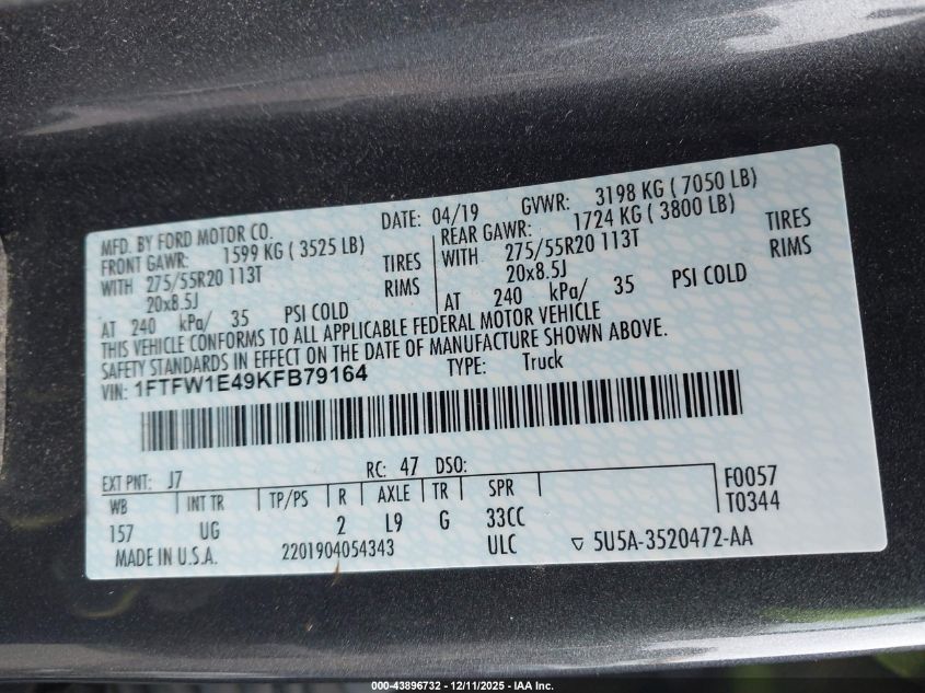 2019 FORD F-150 2019 року Бензин, 3.5, Повний привід, vin - 1FTFW1E49KFB79164 з США