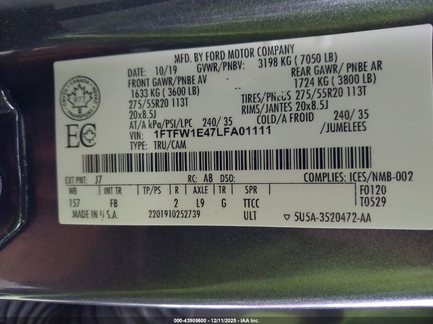 2020 FORD F-150 2020 року Бензин, 3.5, Повний привід, vin - 1FTFW1E47LFA01111 з США