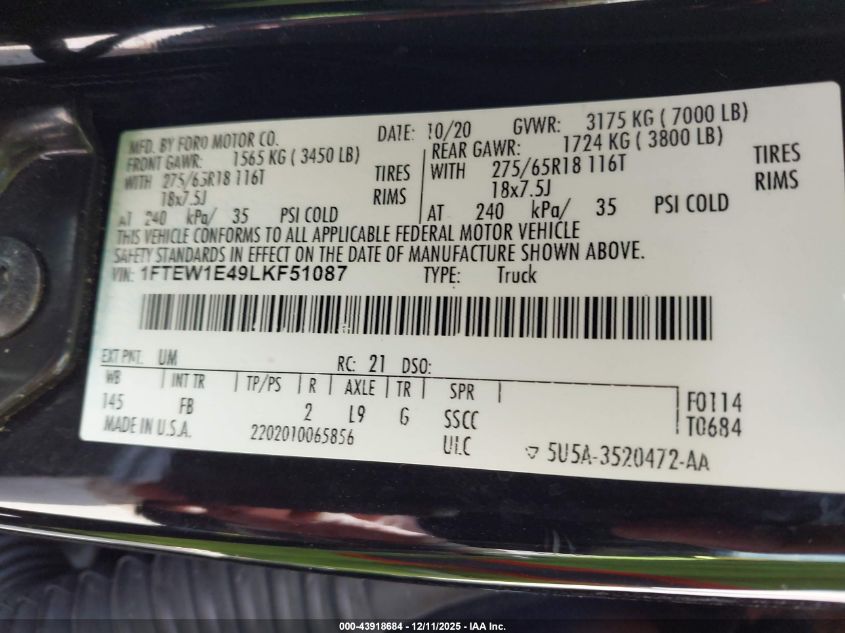 2020 FORD F-150 2020 року Бензин, 3.5, Повний привід, vin - 1FTEW1E49LKF51087 з США