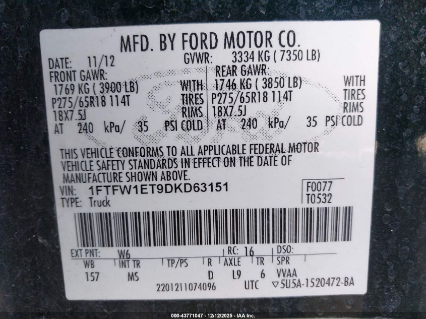 2013 FORD F-150 2013 року Бензин, 3.5, Повний привід, vin - 1FTFW1ET9DKD63151 з США